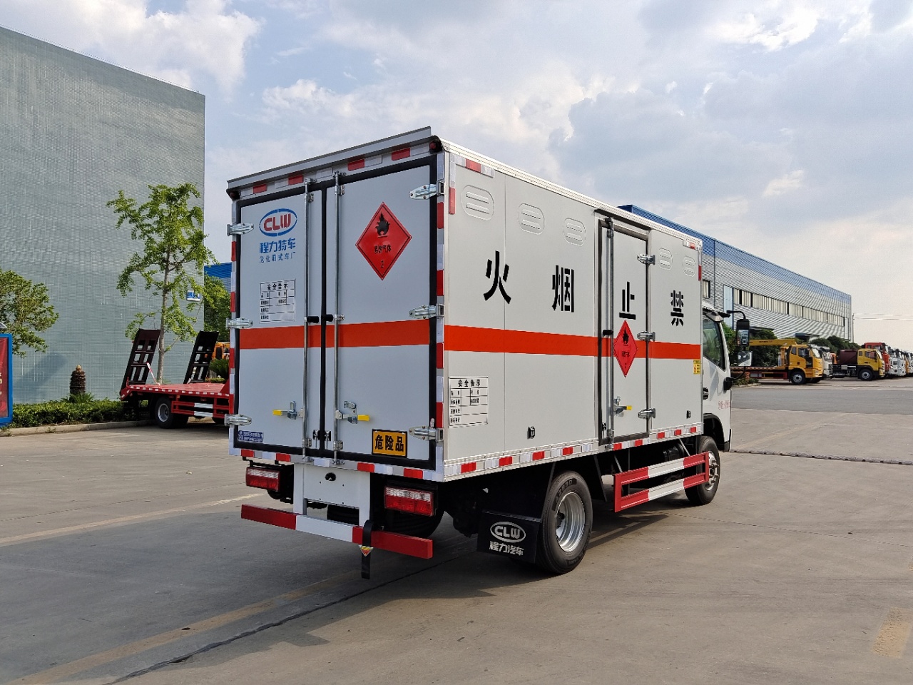 | 貨箱配置 | 廂體為雙層金屬骨架結(jié)構(gòu),外板采用冷軋鋼板,中間填充阻燃泡沫,內(nèi)飾為鋁板。底板為平板上鋪防靜電膠皮。廂內(nèi)兩側(cè)加裝固定貨物臥環(huán),門框帶防盜報警器,頂部帶煙霧報警器,廂體右側(cè)選裝側(cè)門,隨車配2個滅火器,危險標(biāo)志牌,防火帽,危險品三角頂燈。(也可用瓦楞板) | ||