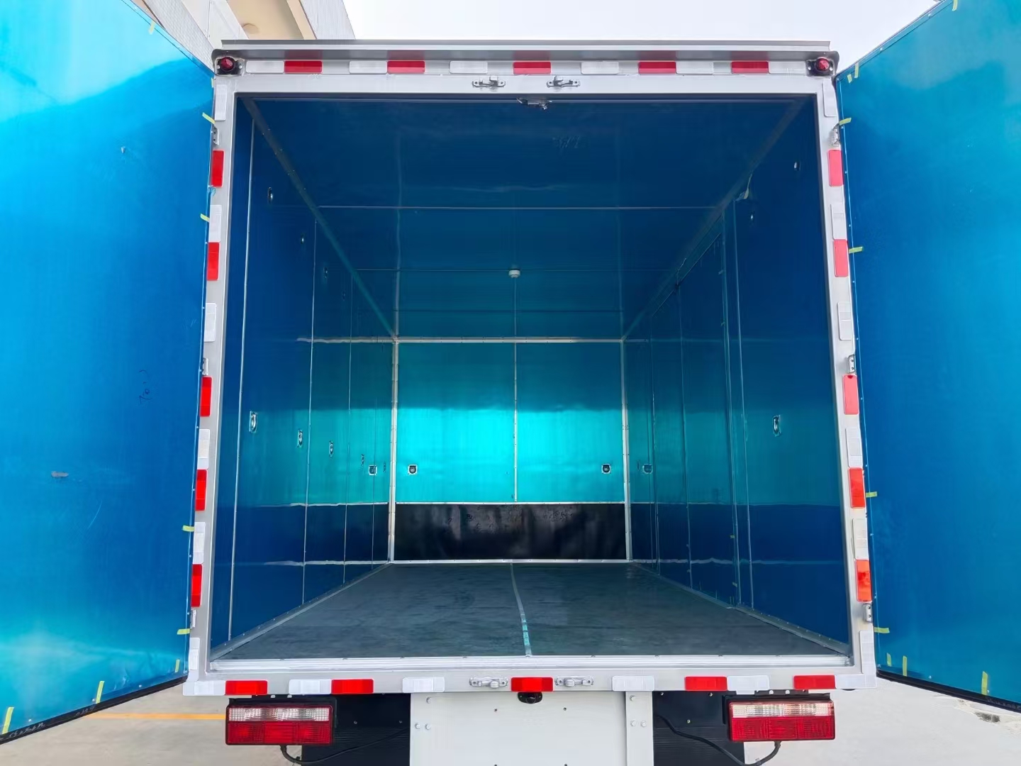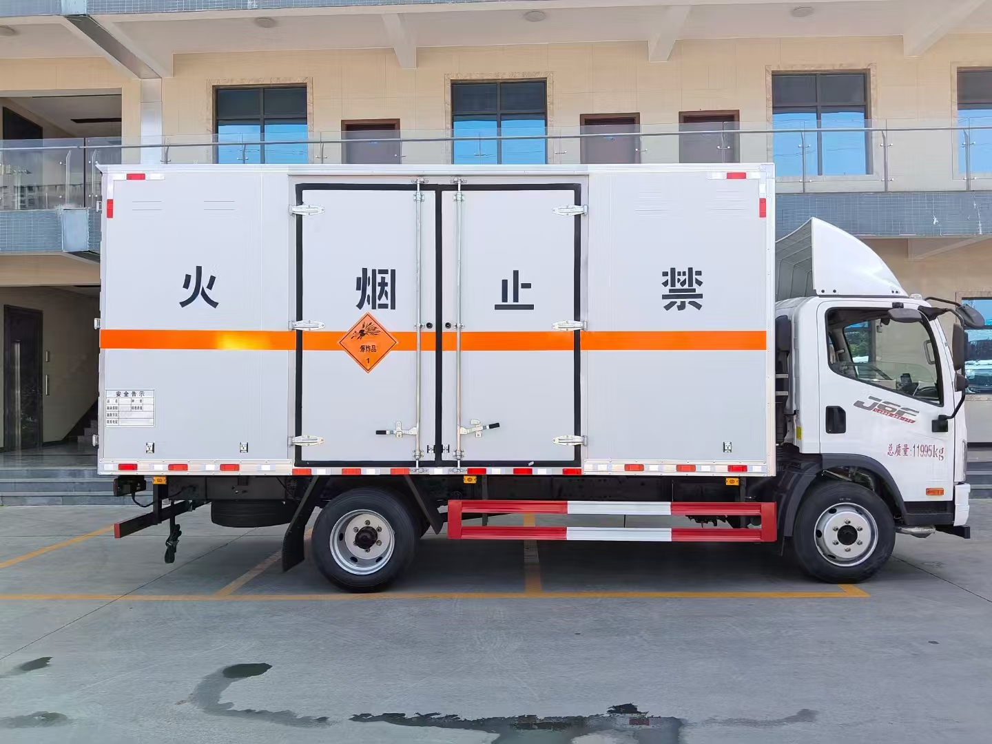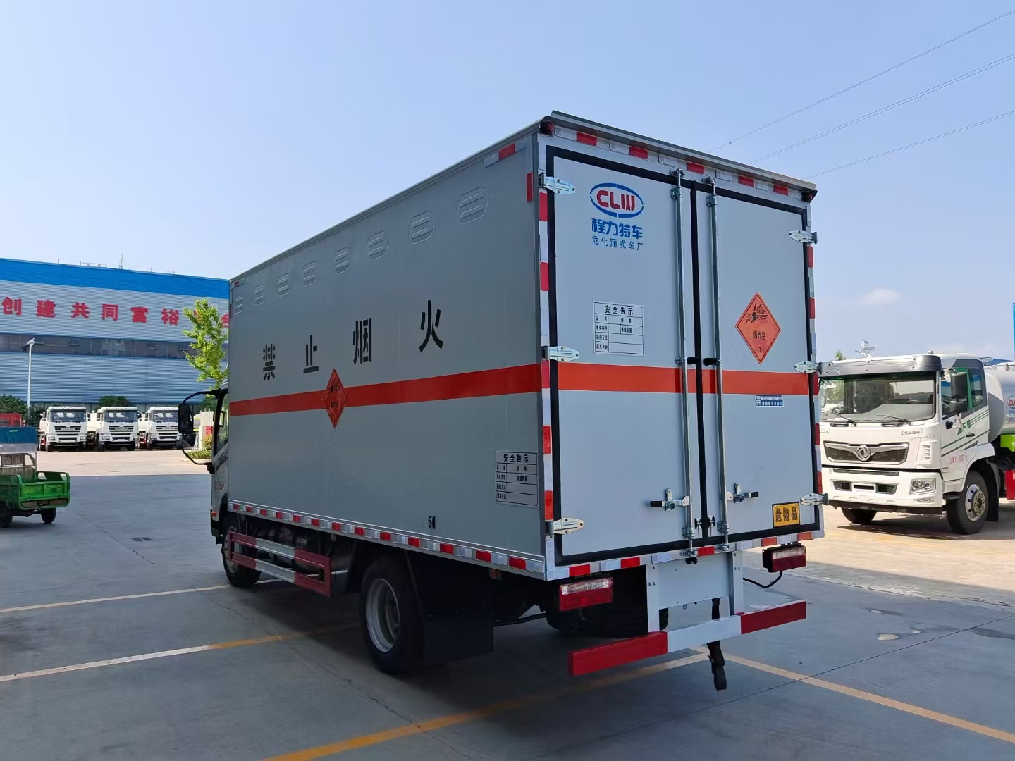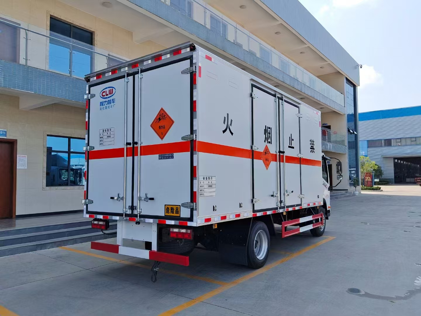 | 貨箱配置 | 廂體為雙層金屬骨架結(jié)構(gòu),外板采用冷軋鋼板,中間填充阻燃泡沫,內(nèi)飾為鋁板。底板為平板上鋪防靜電膠皮。廂內(nèi)兩側(cè)加裝固定貨物臥環(huán),門框帶防盜報(bào)警器,頂部帶煙霧報(bào)警器,廂體右側(cè)選裝側(cè)門,隨車配2個(gè)滅火器,危險(xiǎn)標(biāo)志牌,防火帽,危險(xiǎn)品三角頂燈。 (尾部可選裝液壓升降尾板) | ||