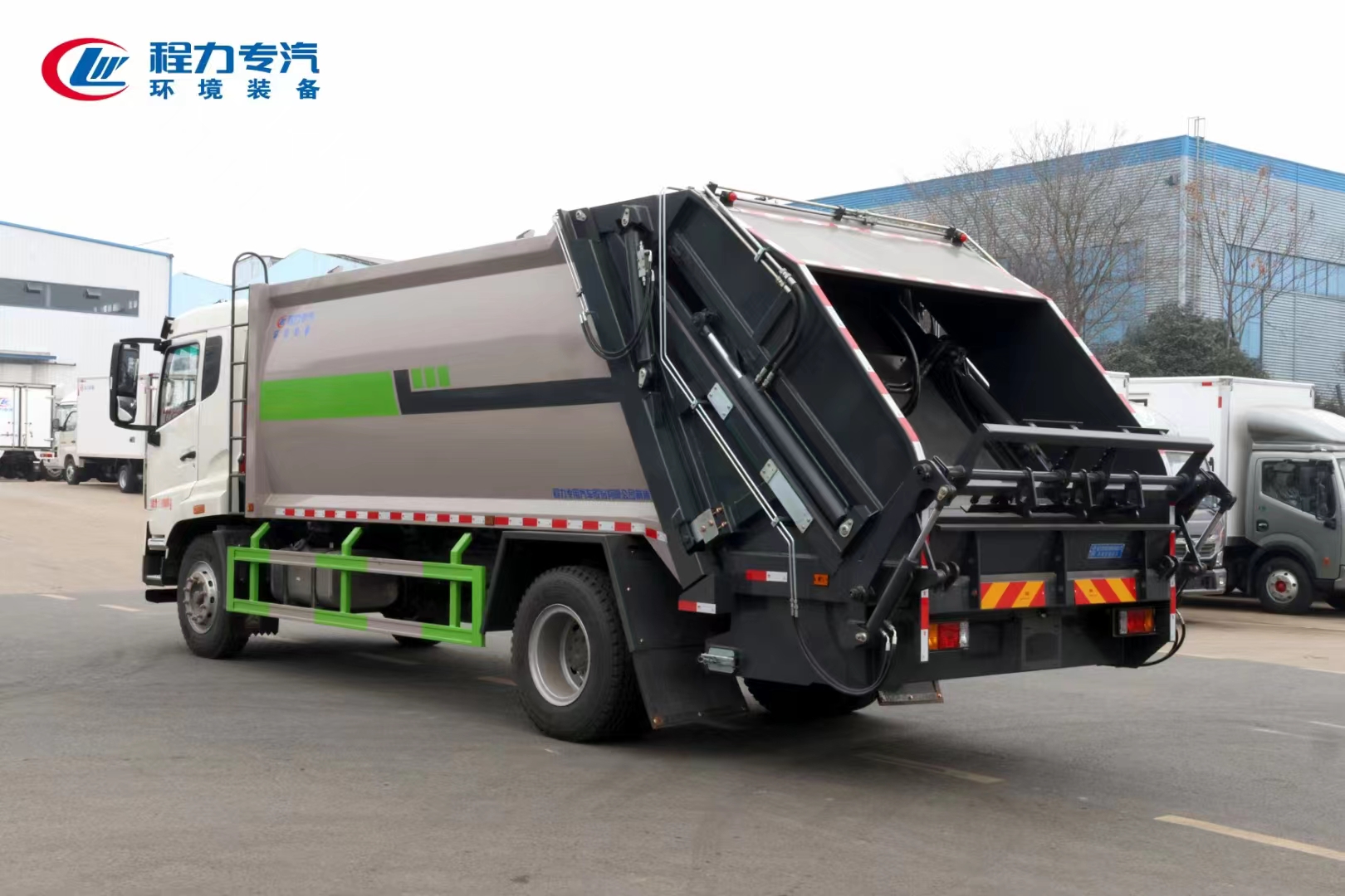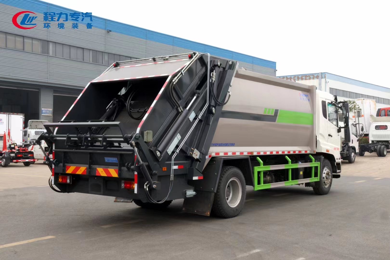 | 上裝配置 | 上裝為弧形箱體結(jié)構(gòu),采用Q345(局部采用T710)高強(qiáng)度板制作。有效容積15-18立方,采用中梅大通徑五聯(lián)手氣一體多路閥,全系標(biāo)配背壓閥(增加雙向壓縮比),合資鐵殼液壓齒輪泵,嘉善取力器,中梅手氣一體多路閥,恒力油缸(質(zhì)保兩年),加強(qiáng)型掛捅后翻轉(zhuǎn)機(jī)構(gòu)(可選裝三角斗、全密封斗、擺臂等翻轉(zhuǎn)機(jī)構(gòu)),外置滑板缸結(jié)構(gòu)設(shè)計(jì),石墨烯尼龍滑塊,長沙福力CAN總線控制系統(tǒng),尾部帶有硅膠控制面板,標(biāo)配無線遙控,帶光電感應(yīng)保護(hù)裝置,標(biāo)配后污水箱,(中聯(lián)樣式雙排污口),可加裝側(cè)邊污水箱。加裝氣動密封蓋。 | ||